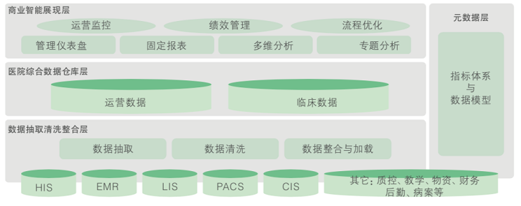 1)基于醫院戰略發展的需要,醫院信息化經過這些年的建設信息系統面臨轉型,即從面向應用到面向分析的轉型,同時能夠提升信息系統價值,使信息化向數據分析、決策支持領域邁進。